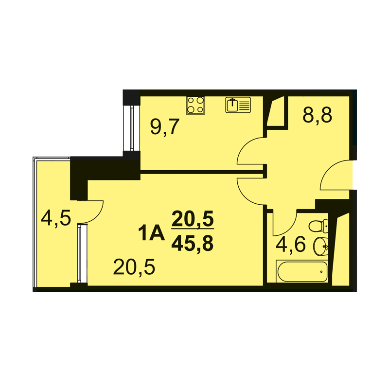 Однокомнатная квартира площадью 46.90 м2