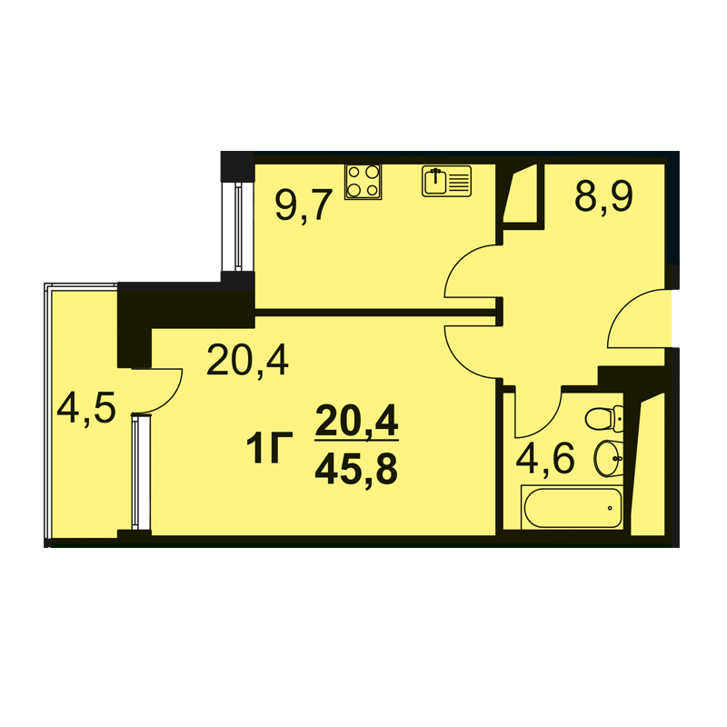 Однокомнатная квартира площадью 46.20 м2